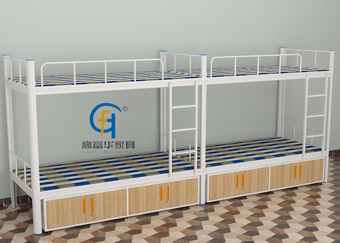 現在上下鋪鐵床的款式種類是多種多樣的,其中帶床底柜的韶關雙層鐵床是使用比例較多的,因為,它不僅可以使有限的宿舍空間增大利用率,而且,能省錢,方便儲物,避免在給學生、員工另配儲物柜,浪費不必要的資金。